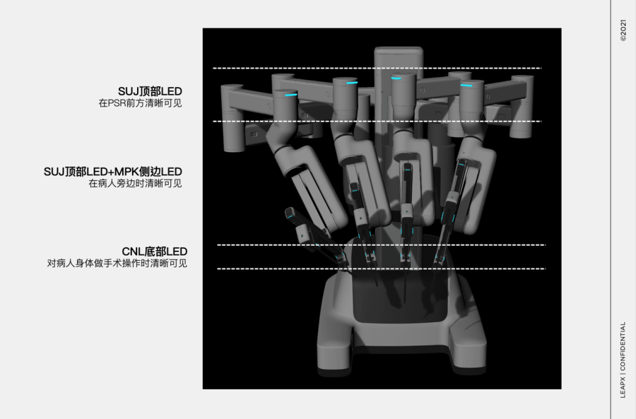 我们对手术室现场不同位置的医护人员在手术各阶段看到的LED视角都做了模拟,确保所有人每时每刻都能够清晰辨别各个机械臂的位置和状态。