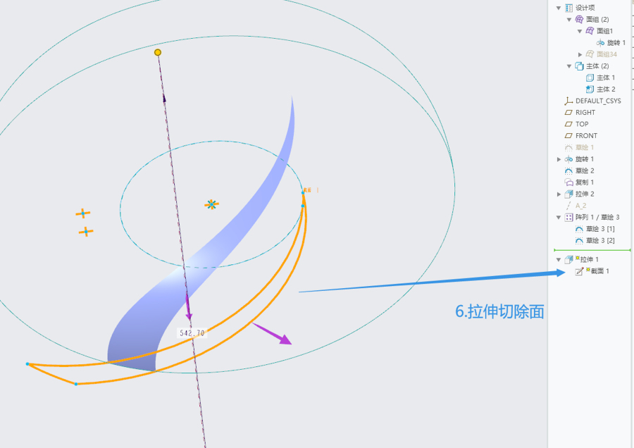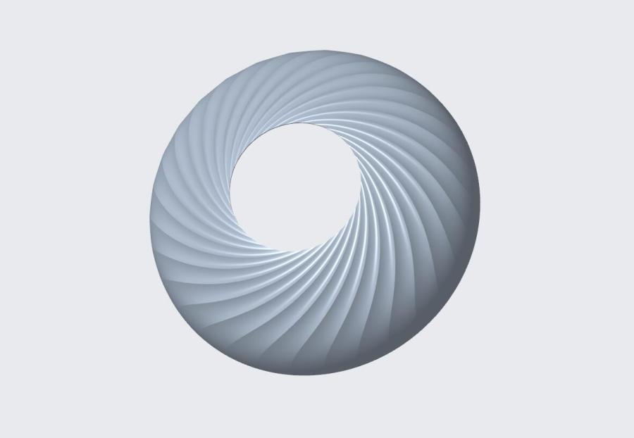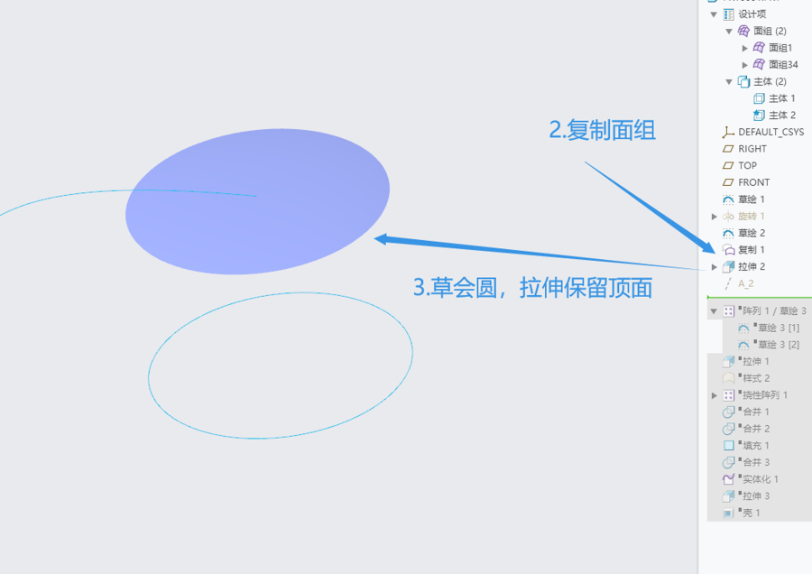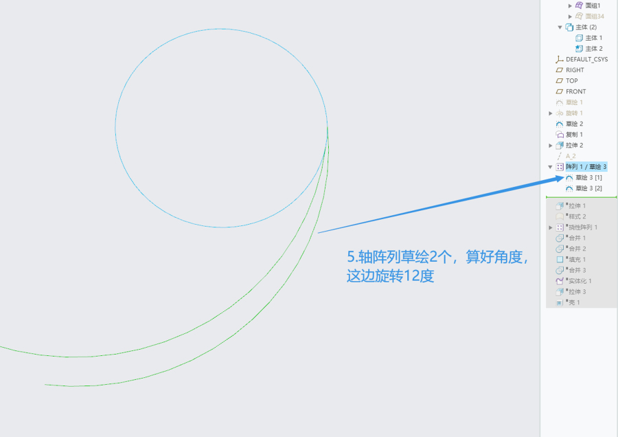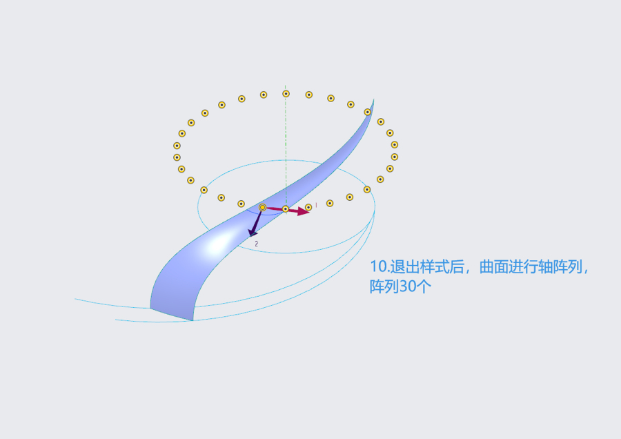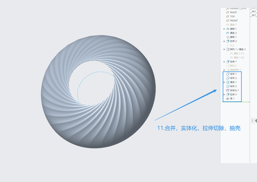 这是带有环形褶皱的曲面造型,由单个曲面阵列形成,软件为creo,犀牛建模思路差不多,大致如下: