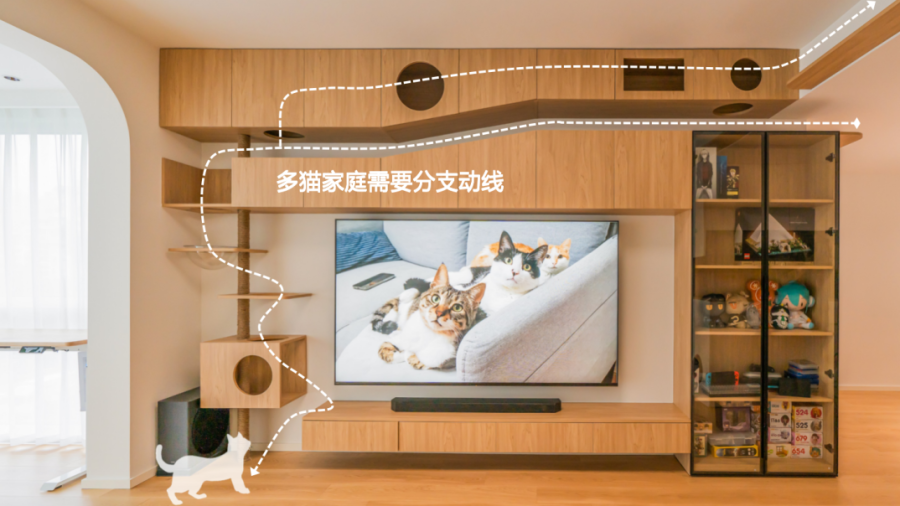 我认为,最理想的人宠关系在于相互陪伴而又各自独立。正如我们设计的案例中所展现的,人与猫的活动区域虽然分离,互不干扰,但彼此之间却存在着深厚的情感依赖。我家的猫便是一个生动的例子,它总是如影随形地跟着我,这让我感到它非常需要陪伴。