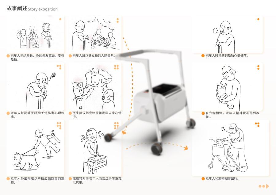 目前中国已进入老龄化社会,但是如此庞大的老龄群体,他们的心理健康状况却长期遭受忽视,“伴 侣宠物”的陪伴能够改善老年人抑郁情况,因此提倡老年人养宠很有必要。同时中国半失能和失能老年人数量达到6400,他们的出行也是个巨大的社会问题。基于以上发掘的问题点,得出了具携宠物功能的关怀老年人助行器的设计点,在帮助老年群体出行的同时也能够起到情感关怀的作用。