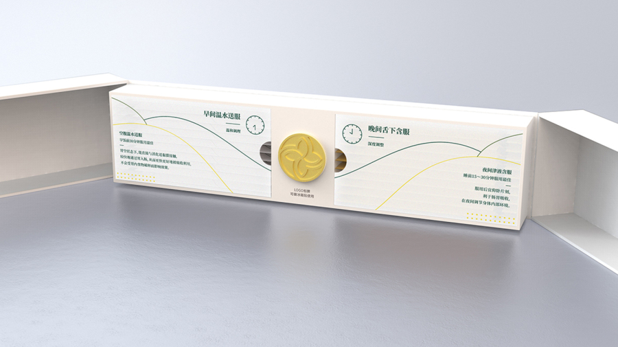 人体在早上和晚上是最好的滋补时间,设计早晚两种产品包装,应对不同时间身体情况合理调理:一日之计在于晨,睁开眼又是新的一天。经过一夜的消耗,身体急需营养。日包通过温水送服,让身体温和吸收同时又补充了水分。而深夜降临,一天的劳顿让身体已经疲乏不看,通过将夜包舌下含服,补充身体消耗,帮助入睡。