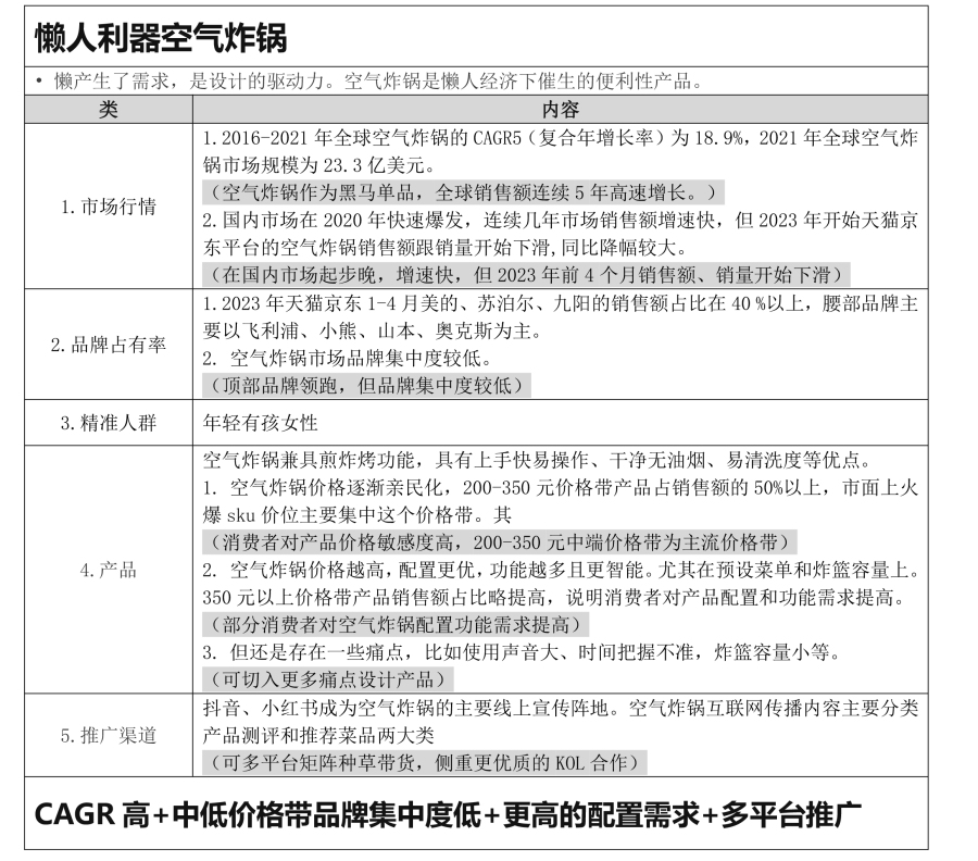 • 空气炸锅在中国市场起步较晚,但销售额增长快。受疫情影响,居家做饭的场景越来越多,做饭社交加上懒人经济,这也导致空气炸锅市场的火热。