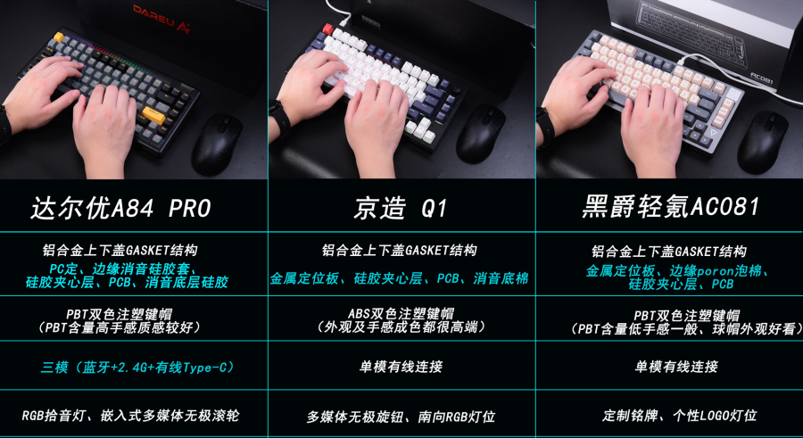 今天主要为大家带来的是京造Q1、达尔优A84Pro和黑爵轻氪AC081三款国产gasket结构机械键盘的拆解分享,让我们从结构及用料去了解一下现在国产机械键盘到底如何。