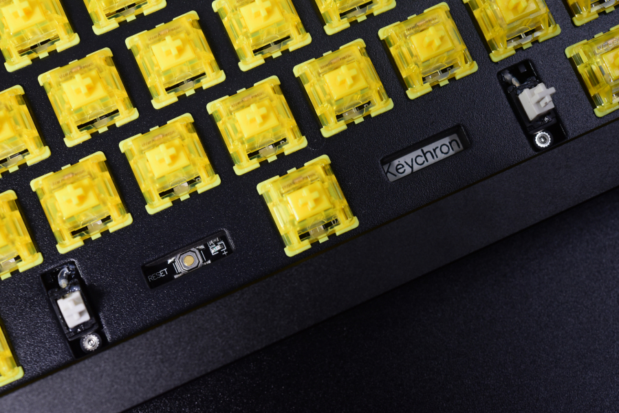 京造Q1另一大特色就是全套佳达隆轴(佳达隆幻影黄+PCB卫星轴轴)和南向灯位,简单点理解就是轴座反装,灯位直接对着使用者,侧刻透光键帽会有奇效。但轴体也反过来,部分键帽不兼容,例如原厂高度的键帽就会出现卡键帽的情况。