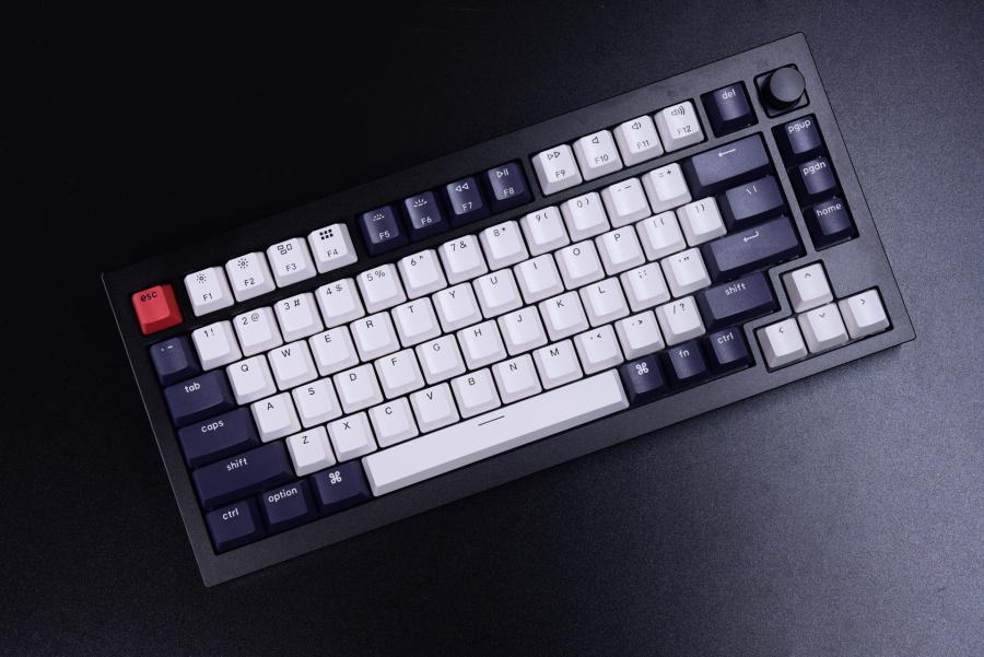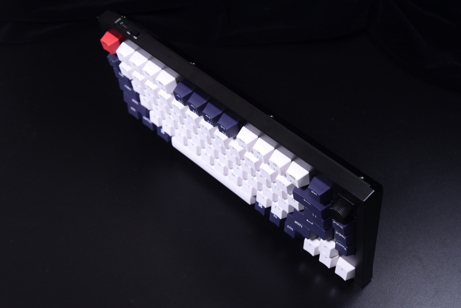 整体配色突出了一个稳字,深蓝与白色键帽搭配,纯黑色的铝合金上下盖。右上角设有多媒体无极旋钮。