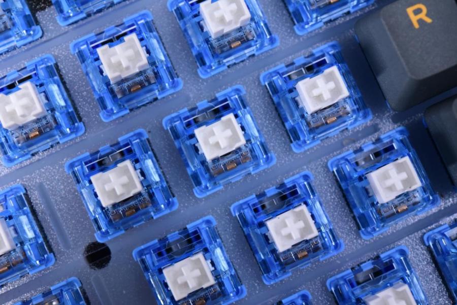 轴体方面直接采用自家的天空轴V3,大致手感类似于金粉,结构也和金粉差不多,其轻盈手感的特色也带来了不少受众,所以达尔优自家的机械键盘很多都是用上了天空轴V3。