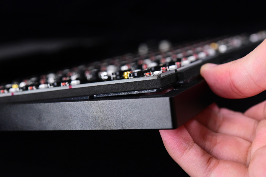 达尔优用料实在这点可以说诚不欺我,PC软韧材质定位板、厚度十足的硅胶层然后再到PCB板,硅胶底棉也是比较厚的。因为是三模版本,底座也设了两个凹槽放锂电池。由于PC定不像上面讲到的金属定位板能起到足够支撑力,对内部结构的厚度和贴合度要求很高,所以这也是达尔优A84pro里面材质要用料实在的原因之一,不然手感就会变得过于疲软。