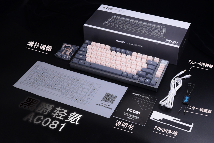 黑爵轻氪AC081也是比较火的一款,除了整机以外,还有单独的套件在售。配件方面也是比较常规的。由于个人比较喜欢box白轴,就选了这个和平版。