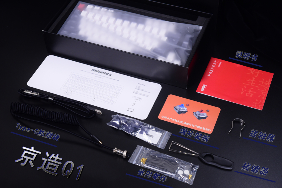 京造Q1是这三款里面唯一配备了航插线的,而且航插线采用双Type-C接头和USB转换接头(能兼容部分Type-C接口的笔记本电脑),除此以外还贴心地给了一代备用零件(后盖螺丝、内部海绵条)。