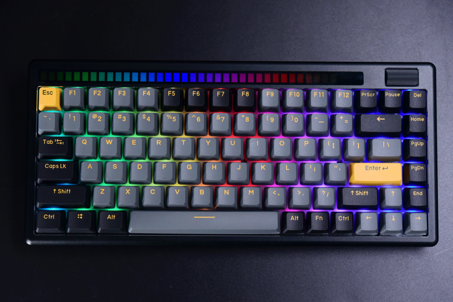 我们可以看到A84pro的键位设计更为紧凑,视觉上来说会比上面两款有键位间隙的好看一点,而且键盘上方还加入了RGB拾音灯带和嵌入式的多媒体无极滚轮,也是让自己的机械键盘有少许不一样的特色了。