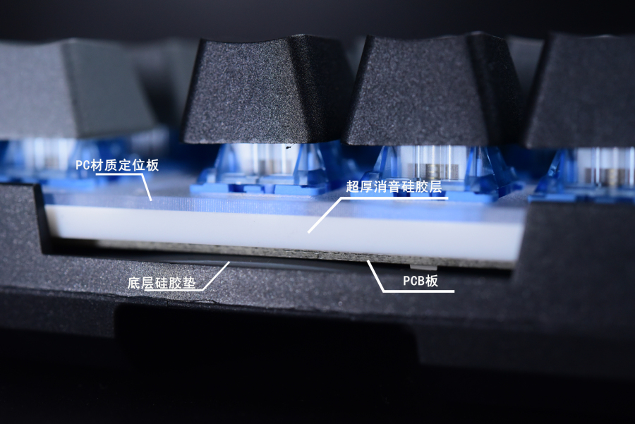 看过之前三模版拆解的朋友可以看出,单模版本的A98内部结构都是一样的,PC材质定位板和PCB板之间的硅胶层可以说非常非常厚实了,在PCB下面还有一层灰色的硅胶垫,所以到手的时候感觉键盘很重,内部完全填充完了。
