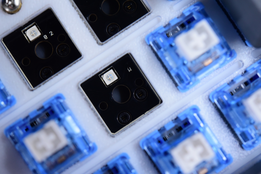 单模版和三模版有一点不同,就是单模版的PC定打孔用螺丝固定了,其实有没有在使用上都一样,猜测是因为之前没螺丝固定,定位板靠四周的硅胶套固定,在拔轴的时候很容易把PC板都给扯松动,所以为了方便经常插拔轴的用户加了个螺丝固定。