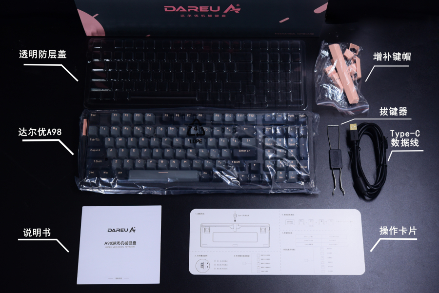 配件方面如上图所示,透明防层盖仿佛成为了达尔优A系列机械键盘的标配,每款都有配送。