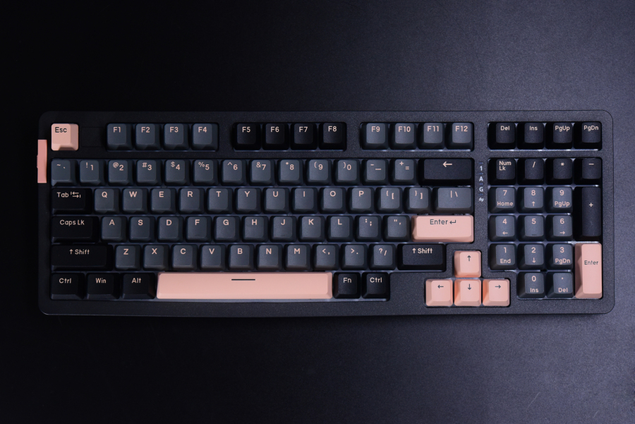 换上粉色的增补键帽后就变这样了,感觉原本出厂的键帽配色比较自然好看一点。