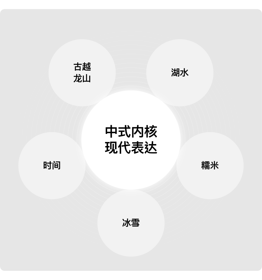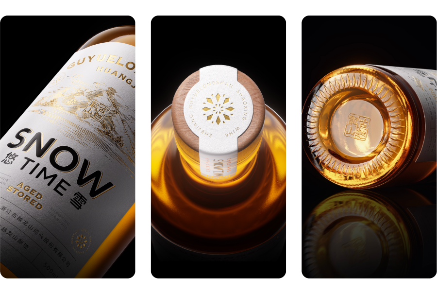 古越龙山悠雪,基于“黄酒的四大元素:湖水、糯米、时间、冰晶”这一核心主题,打破传统刻板印象,在尊重黄酒传统深厚内涵的同时,大胆使用国际化视觉语言和现代设计手法进行创新。