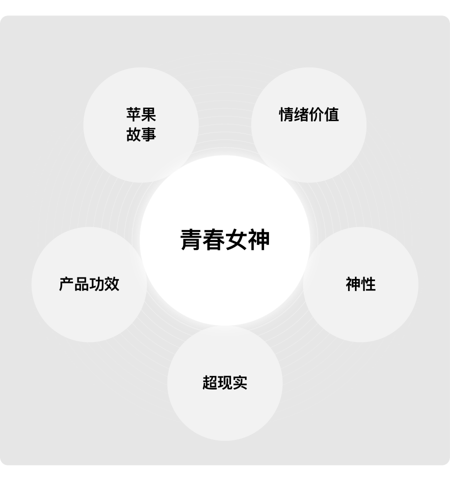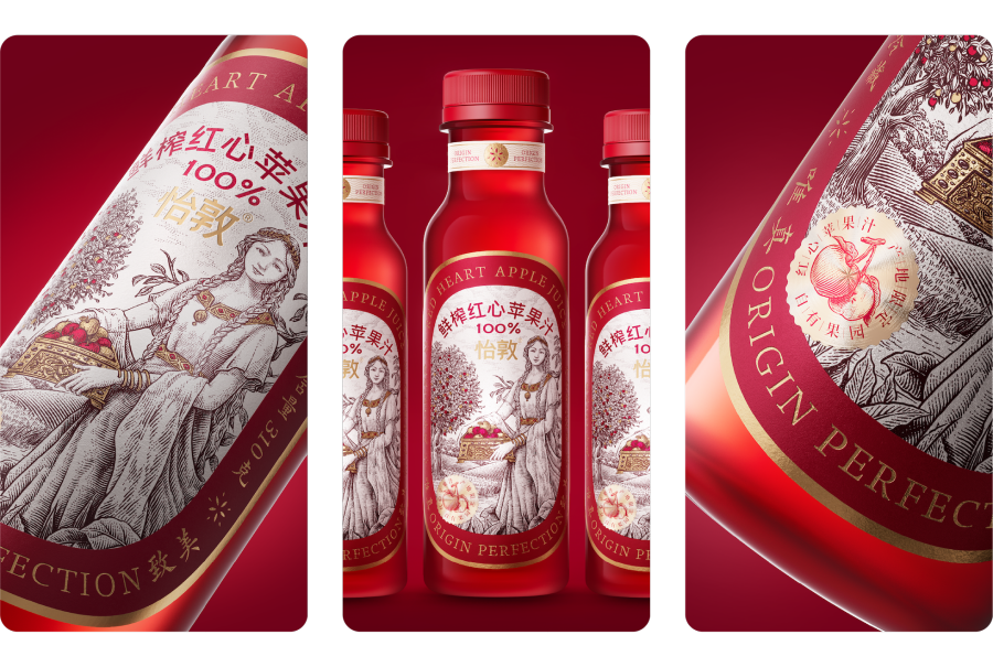 核心主题以怡敦女神的形象为主题,将苹果的抗氧化功能和大家对青春健康的追求相结合。以深邃的红色为主调,缀以金色光芒,讲述自然与艺术交织的故事。