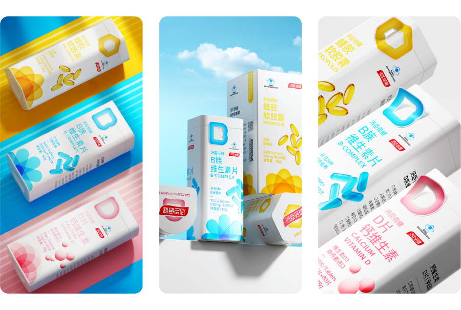 产品瓶身上的光感渐变设计,仿佛透过光线折射出营养的活力,强调补充维生素与蜂胶的天然精华,让健康变得可感、可触、可识别。简洁的文字排布搭配温润的色调,强化功能性信息的同时,更凸显品牌专业、安心的形象。
