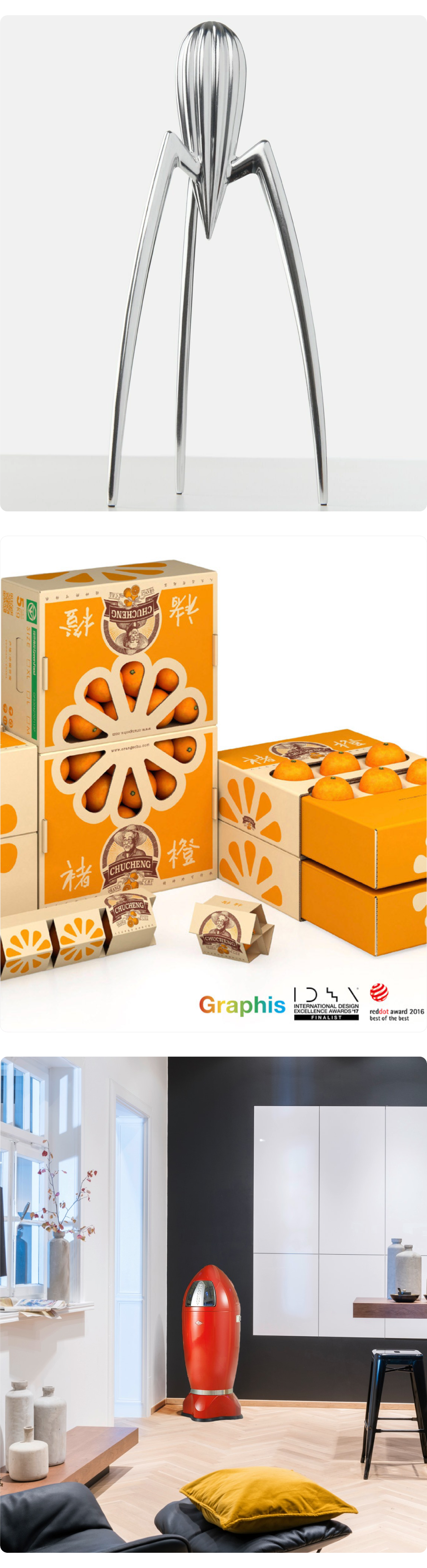 比如:菲利普斯塔克设计的榨汁机就是有主题的,非常突出的“外星飞船”,这个主题赋予了产品一种超现实的视觉冲击,而潘虎设计实验室设计的褚橙包装把“褚老一生经历”融入到包装设计中,展现了品牌独特的文化和情感。Wesco火箭垃圾桶则结合了火箭的动感与突破精神,通过不完全封闭的开口和分段式结构,传递未来感与科技感。