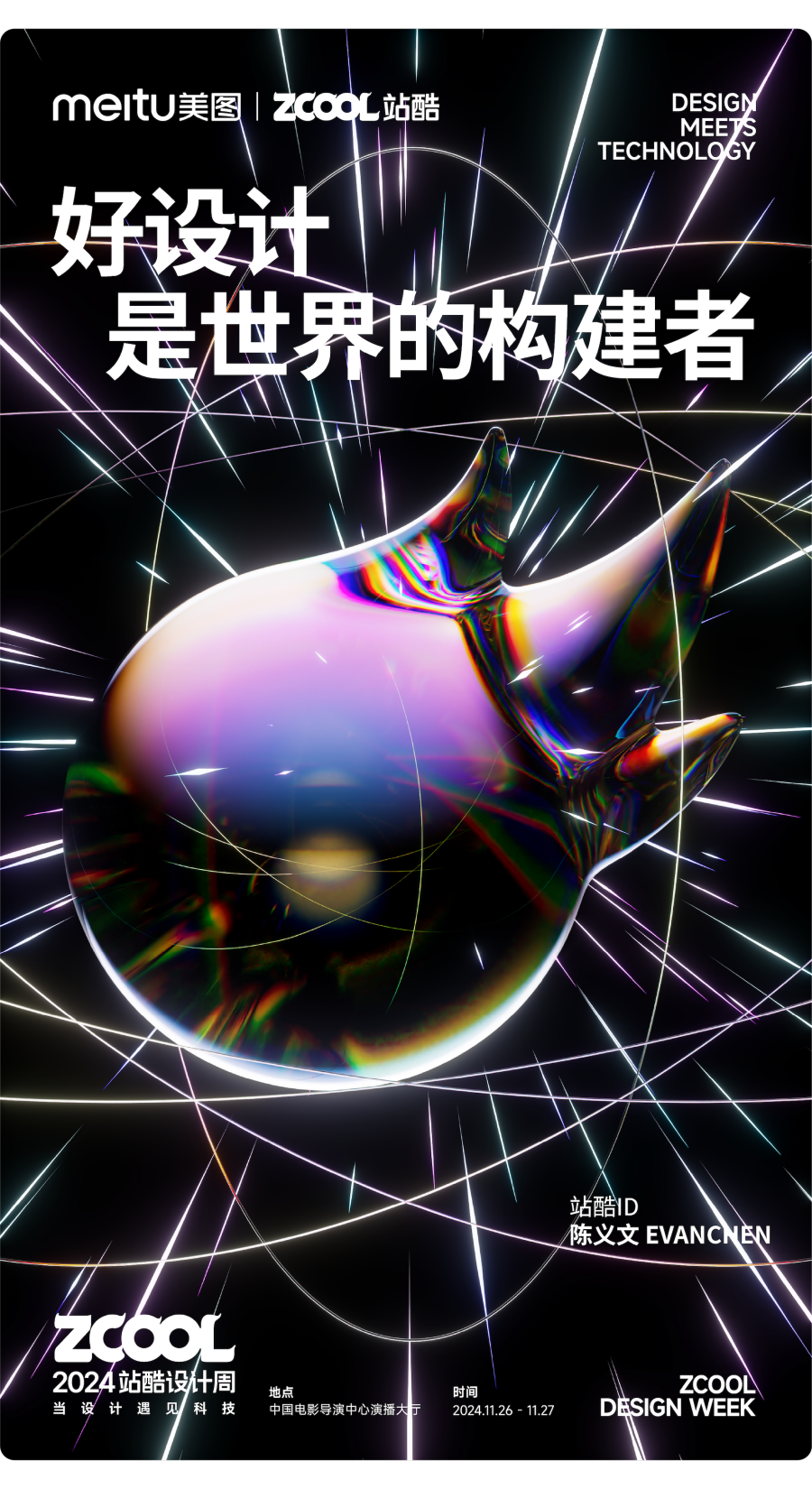 就在刚刚圆满闭幕的2024站酷设计周,我们受邀请为其设计联名主视觉海报,核心主题以宇宙观和大气层视角,以站酷视觉资产为主体,体现未来感与科技感。水滴中心蕴含了ZCOOL类似镜头的反光,或是站在透明反光球体面前凝视时,球体中的观者…