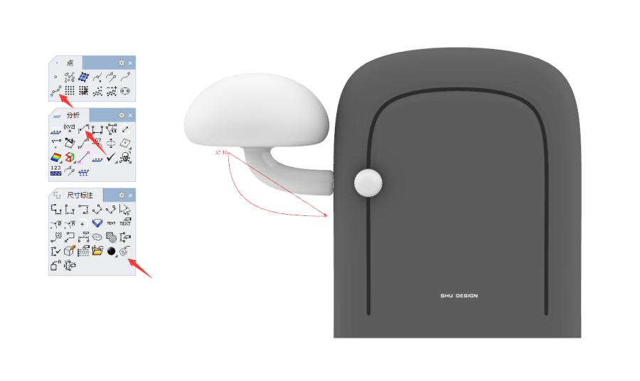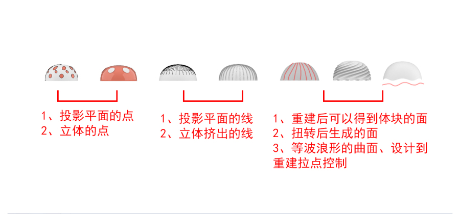 4. 通过对象图进入到第一阶段形体的分析,结合三维软件去操作,结合工具得到基本造型的面也是现实产品中的面。如下图蘑菇灯罩的面,在还没入门造型设计不懂产品面的构成,以下展示我的理解:所需要用的工具能制作出来的产品块面形式表达。