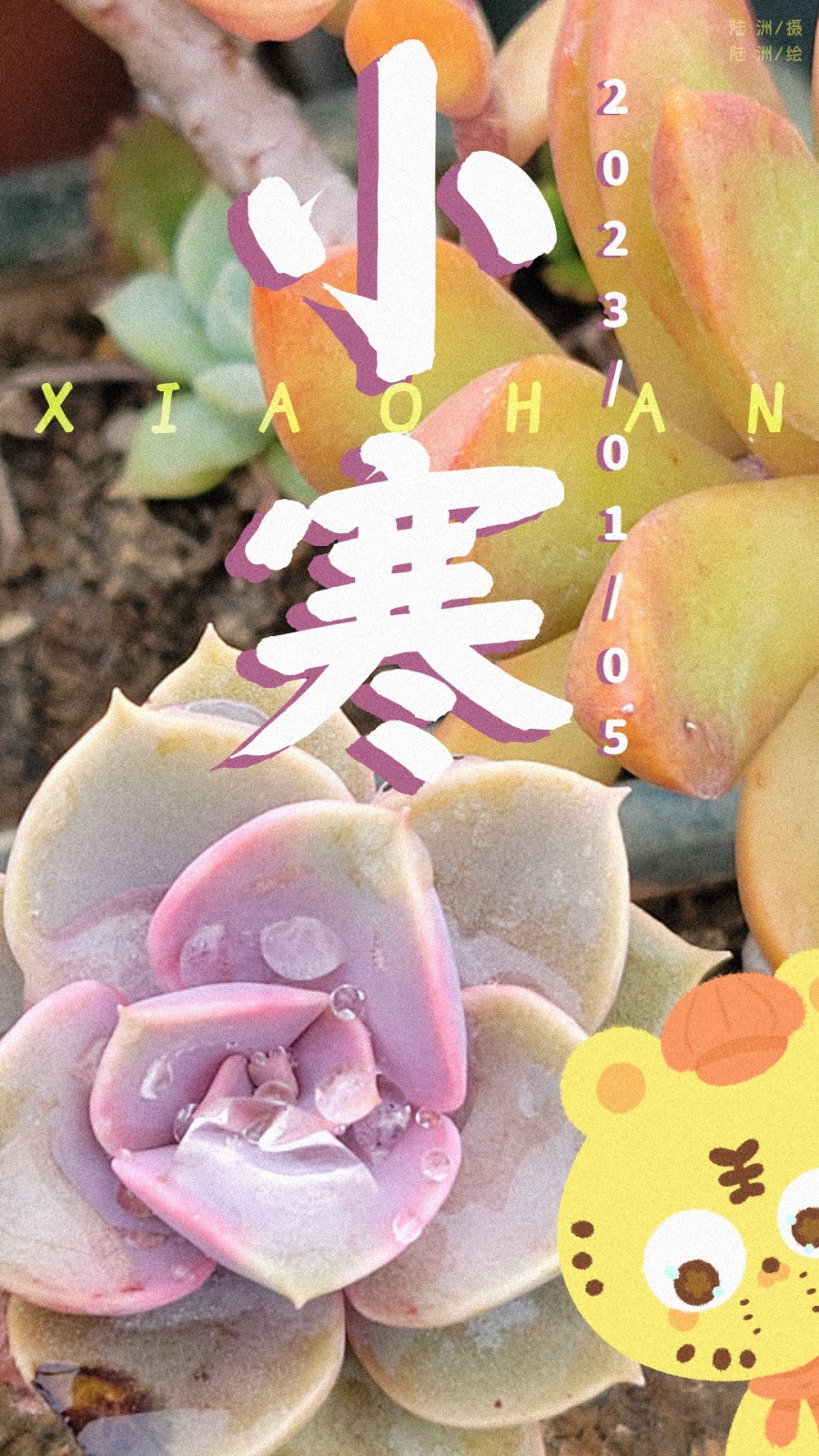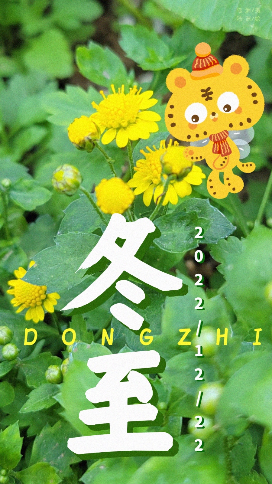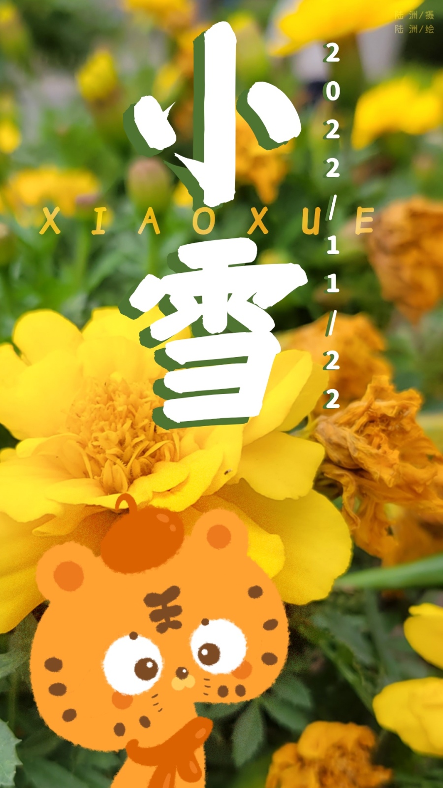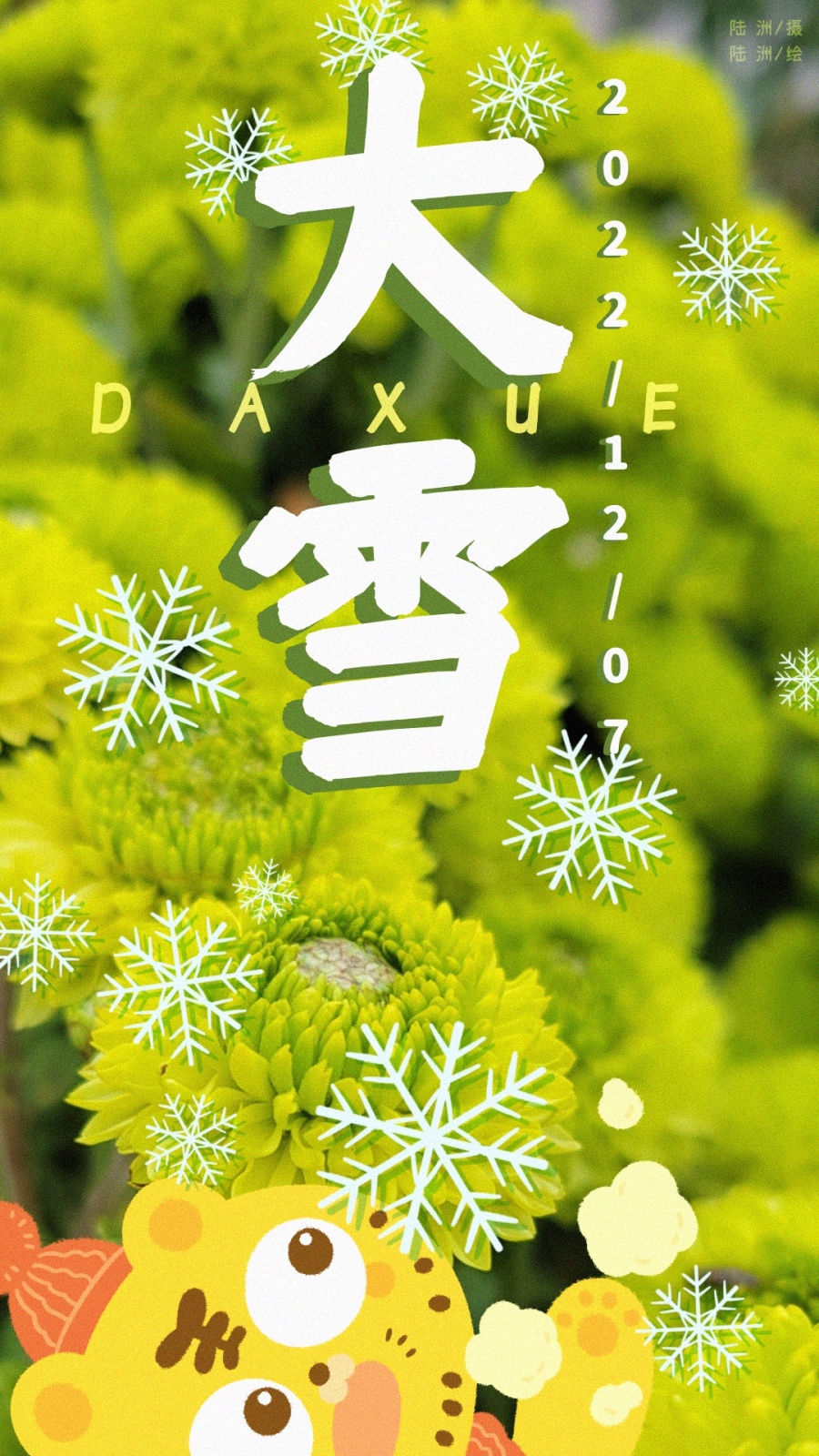 【大雪】地处南方,是没有雪的,以菊花为为背景,点缀了朵朵雪花,营造出下雪的氛围。小老虎戴着毛线帽和围巾,哈出热气。