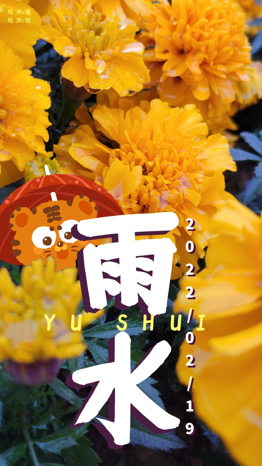 【雨水】小老虎撑着一把小红伞,躲在花丛中,花瓣里的雨珠揭示雨水节气的湿润。
