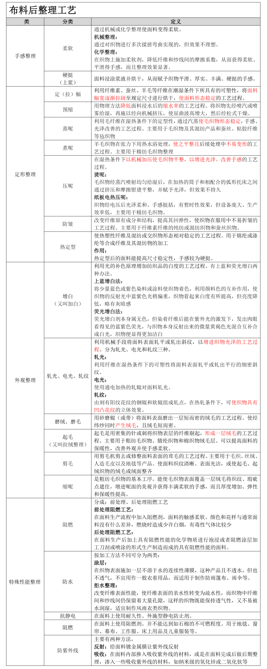 • 布料后整理工艺是通过化学或物理的工艺改善面料触感和外观、增进性能或赋予其他特性的技术处理方式,是纺织品“锦上添花”的加工过程。
