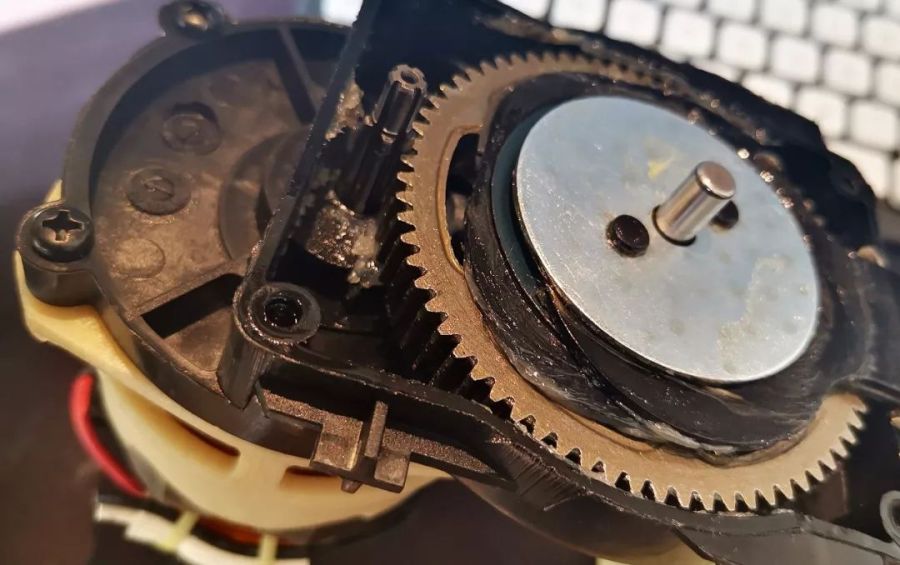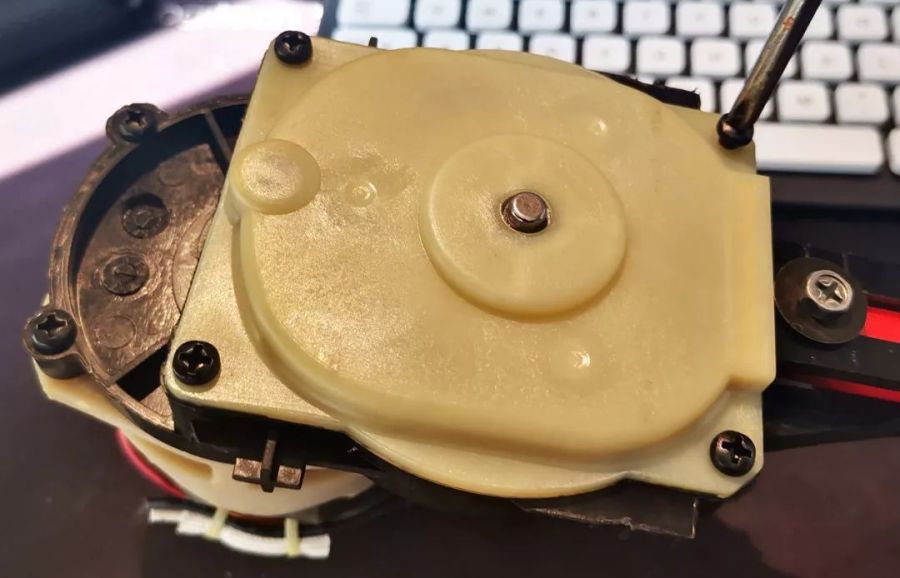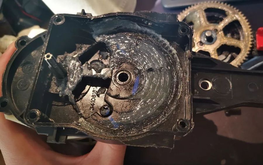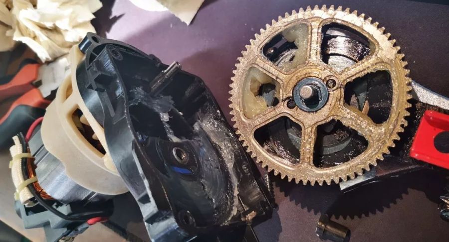 我们能看到一个大比例的变速齿轮组。这是为了实现增大扭矩。拿出大齿轮,里面充满了固体润滑油。