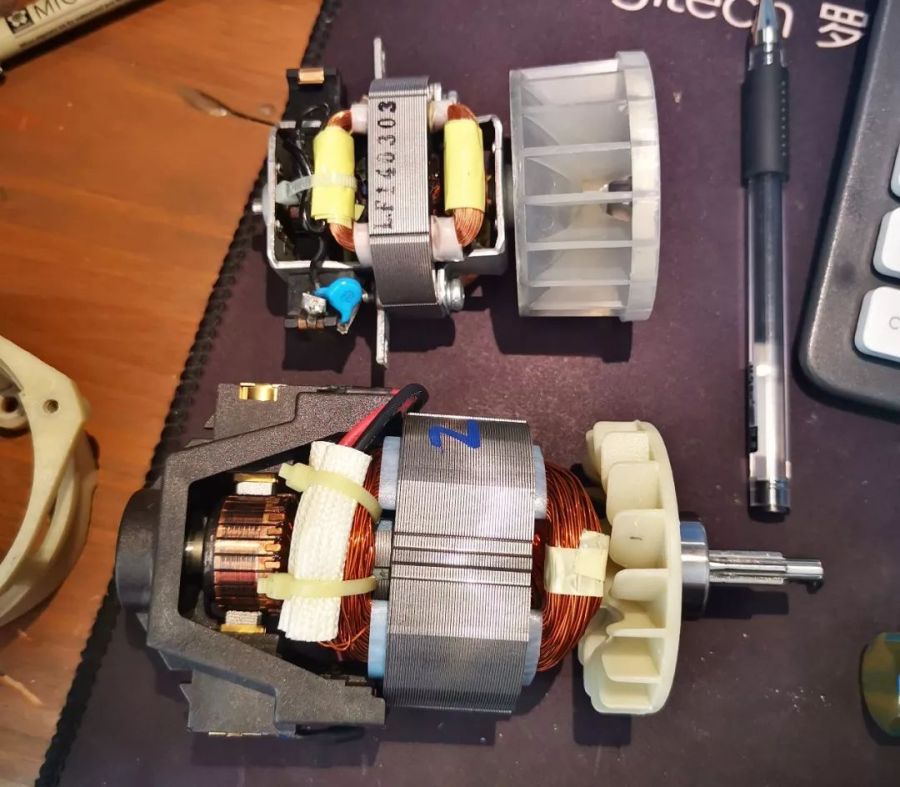 之前电吹风的教程中,已经了解过了电机的样子。我们把两个电机放在一起比较一下,看看它们体量差距。
