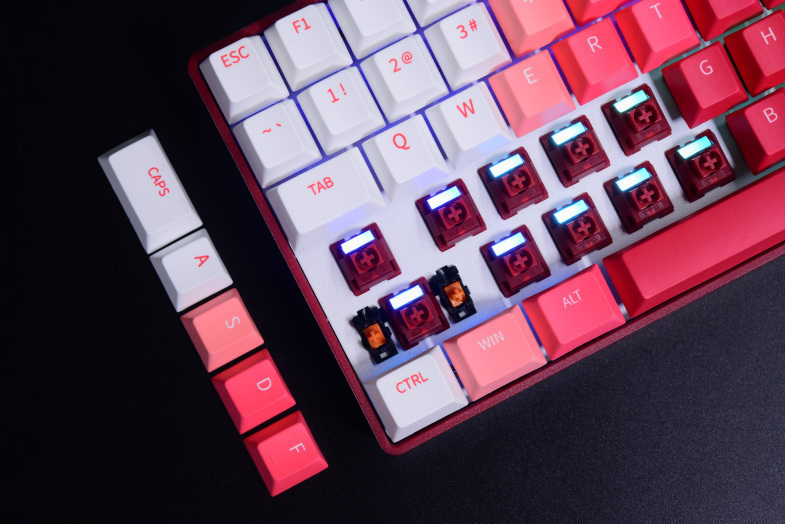 由于当时首发搭载的是TTC新推出的烈焰红轴,拥有导光柱与Q弹手感设计的轴体也成为了这把键盘的一大卖点。