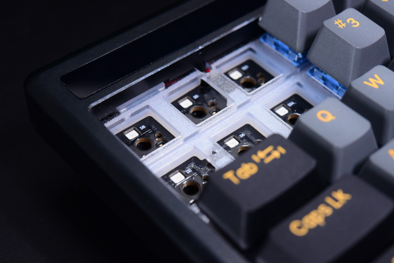 从热插拔版本开始,达尔优A系列开始在PCB与金属定位板之间加入很厚的硅胶层去除空腔,而这也是达尔优机械键盘结构之路的开始。