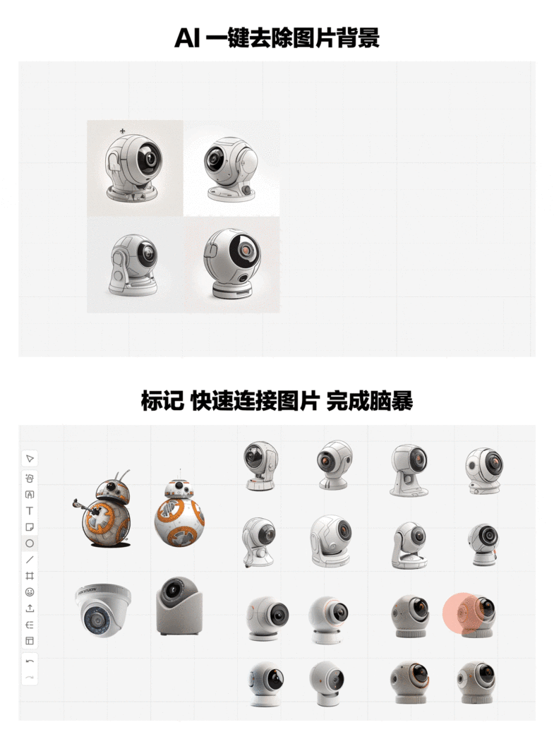 🟠 上次介绍了Notion AI(连接了Chat GPT的API接口),这次讲一下设计流程中通过无限白板工具梳理产品迭代演化。使用到的软件是Fabrie(中国版Miro),有两个非常好用的功能:AI去除背景和快速标记并连接图片 。AI去除背景可以快速将AI生成的图只保留产品本身去除环境干扰,标记连接功能和别的白板工具一样可以辅助头脑风暴以及产品梳理。除了Miro和Fabrie以外,还有一款比较好用的无限白板软件boardmix。(三款软件基本都是按月付费,boardmix可以买断)