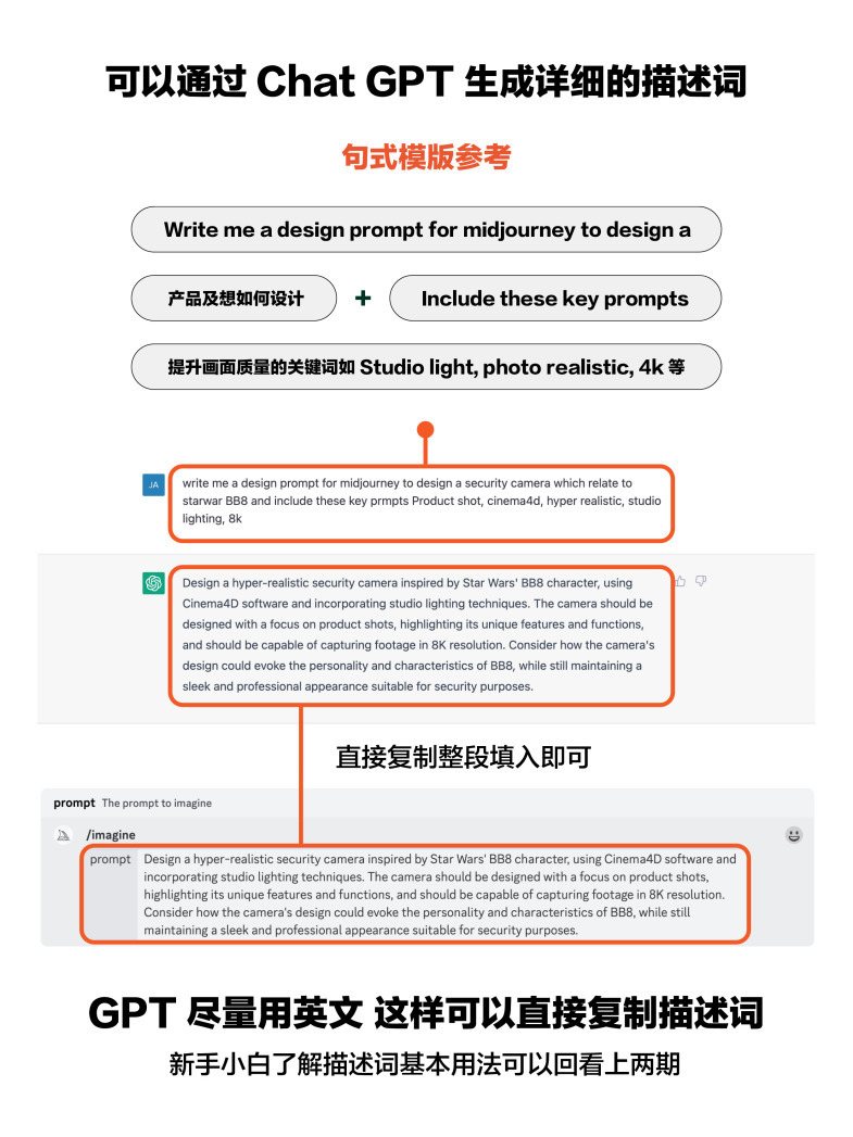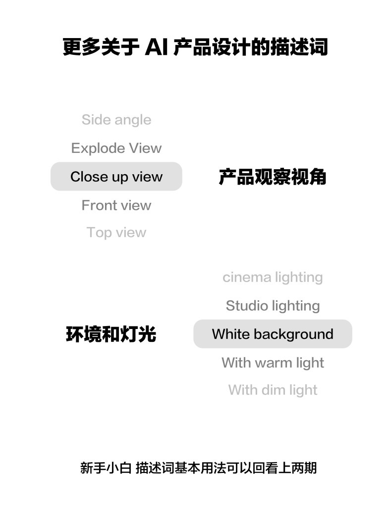 🟠 关于AI的产品描述词:产品观察视角,环境和灯光,以获得更准确的画面构图和光影,结合上两期的基础描述词使用。也可以通过Chat GPT生成更为详细的描述词,参考局势模版并将GPT生成的结果复制粘贴到Prompt框即可。
