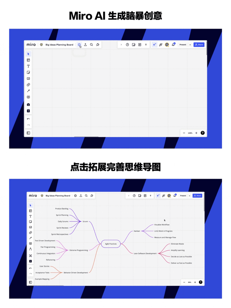 🟠 Miro和Fabrie都内嵌了AI,Miro的AI更加全面一些支持生成图片,思维导图,代码以及联想相关内容。Fabrie的AI助手则套用了Stable diffsion的模型,进行了汉化,SD的模型生成速度比较快,但是效果和稳定性比较差,目前而言不是很成熟所以不推荐使用。建议本地部署Stable diffusion以获得更高的可控性和更稳定的输出结果或使用Midjourney出图。