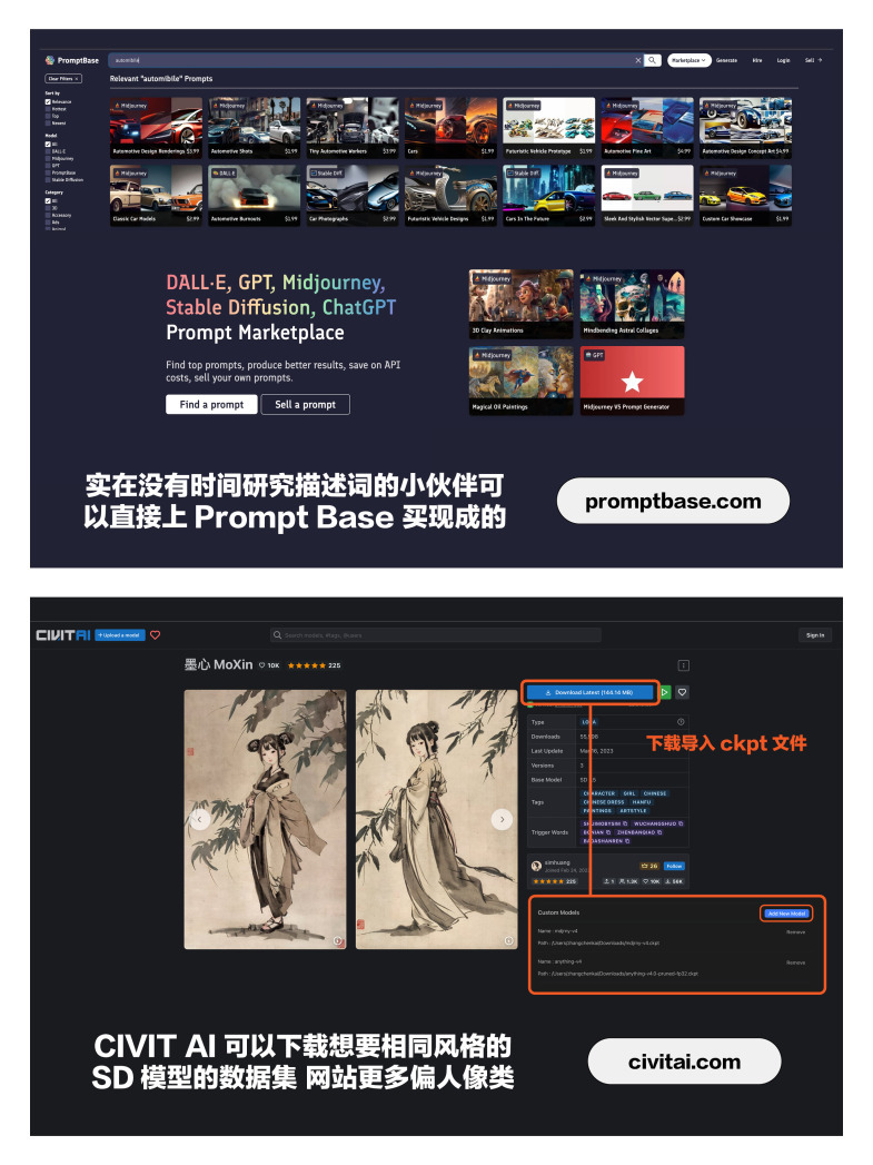 如果还是没法精准输出想要的画面风格可以通过prompt ba-se购买现成的描述词,或者在Civit ai下载SD模型数据集。(CivitAI大多数都是免费下载的 人像居多)