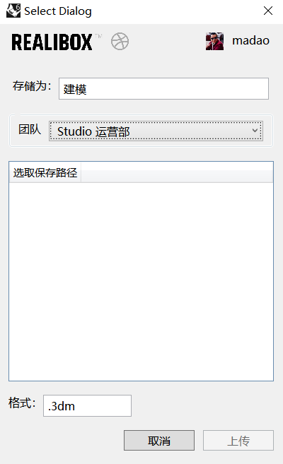 3.选择对应的上传模式后,在弹出的窗口内选取需要保存的目录,该目录需要与Realibox Hub上的项目一致。如果上传了重复模型,会生成一个新的版本保存在Hub内,可通过切换版本来管理这两个文件;