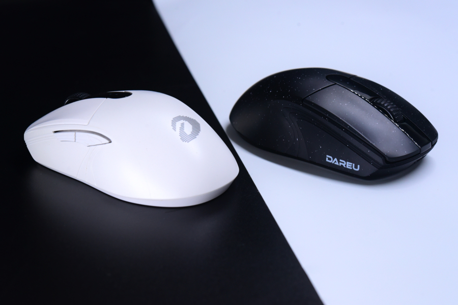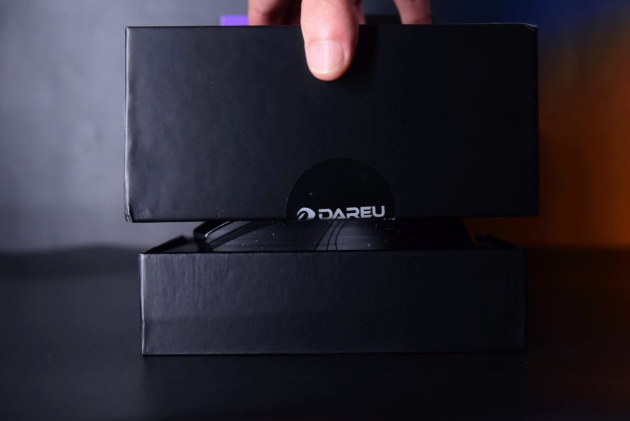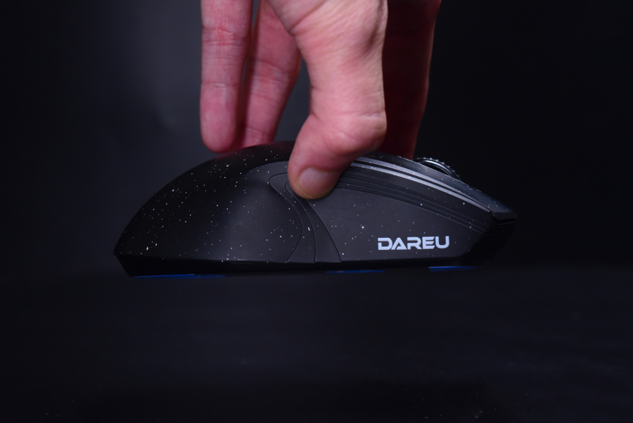 鼠标外形整体也是偏简单的,比较好的一点是,logo不再是大大一个D字母放在鼠标上盖了,DAREU的英文LOGO小小的放在侧裙前端做点缀,整体设计也大气了很多。