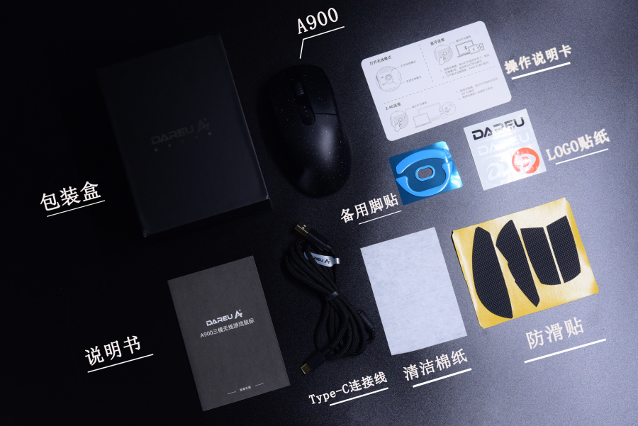 配件方面全部都在鼠标下面的隔层,A系列的好处就是除了配了说明书以外还配了一张操作说明卡,这张说明卡片的内容比说明书简单实用太多了。