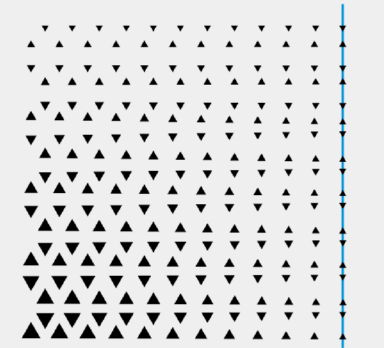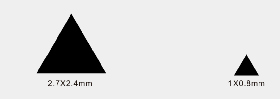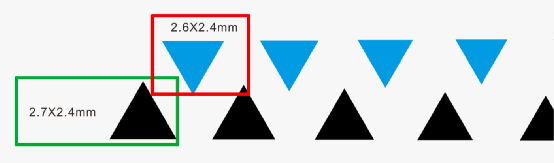 以上文中的某一图案为例,示范使用CorelDRAW 软件制作方法。从生产加工角度上讲,基础单元通常为几何图形,方便模具加工,例如塑胶模具刚针、冲压金属模具。在丝印或印刷工艺时候可以异性图形。 技巧:在设计图案时候,先尖角设计,后续完整所有图案后,一键进入全部倒圆角即可。如图42所示,基础单元中大三角形尺寸2.7X2.4mm,小三角形尺寸1X0.8mm。最小尺寸满足模具冲压要求。 使用【交互式调和】