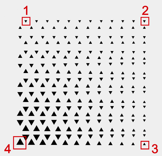要素1,第一感官:第一感知外形和规律。规律是最明显的特征,如规律A,产生动感和差异带来视觉刺激,并用言语可形容。如图37所示,在正方形内感知到中间大,边缘小,并由中间向边缘慢慢扩散。在圆形内感知到中间小,边缘大,并由中间向边缘旋转变化。圆角矩形,在图形内感知到沿着外边缘路径,依次内内圈排列,并由大到小变化。 要素2,视觉流程:首先感觉看到外形和规律,其次仔细观看到大小三角形,最后看到边缘与背景图形匹配。