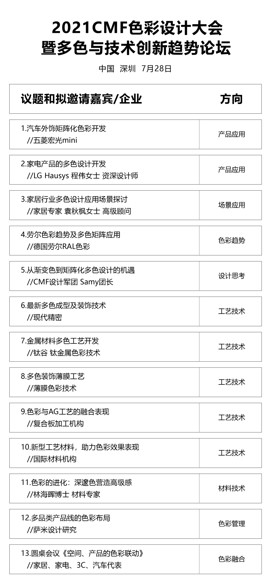 海尔、美的、格力、西门子、奥克斯、小天鹅、海信、康佳、TCL、松下、奥马、长虹、飞利浦、创维、莱克、科沃斯、苏泊尔、史密斯、美菱、九阳、海派、仁宝、罗技、华硕;Apple、华为、小米、三星、OPPO、联想、中兴、vivo、酷派、魅族、乐视、Motorola、传音、努比亚、奇酷360、一加、美图;微软、intel;宝马、大众、广汽、北汽、上汽、一汽、长安、长城、吉利、海马、江淮、比亚迪、奇瑞、现代、中车、陕汽、东风、潍柴、蔚来、泛亚、小鹏、宝沃、伊狄达、开云、同捷科技;佳普、老板、正大、模德、奥普、樱花、欧普、欧派、顾家、华帝;杜邦、库尔兹、巴斯夫、陶氏、PPG、苏威、阿克苏诺贝尔、3M、艾文德、LG;武汉大学、天津大学、东南大学、湖南大学、吉林大学、江南大学、东华大学、同济大学、中央美院、天津科技、天津工业、广州大学、南京艺术学院、浙江理工、浙江工业、中国地质、南京理工、南京航空航天、北京理工、西南交通、广东工业、华南理工、华南工业、华南农业、安徽农业、哈尔滨理工大学;北京服装学院色彩设计研究中心、中国流行色协会、中国色彩中心、爱色丽&潘通、丽华创新制造、江南大学&卡秀堡辉联合创新实验室、荣格、YANG DESIGN等诸多业界同仁,分别来自家电、3C、汽车、家居、资源方、学术界、第三方平台、设计企业等,共同探索CMF,助力行业发展。