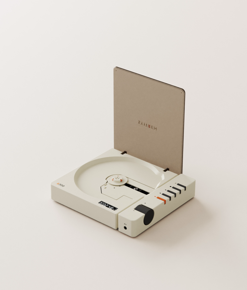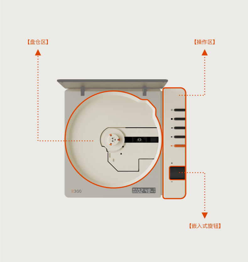 R300的功能分区延续「R系列」的共同特点,使用了基本图形切割——圆形是盘仓,条形是操作区,旋钮为嵌入式圆柱。这种结构语言并不复杂,却天然带有识别性和秩序感。