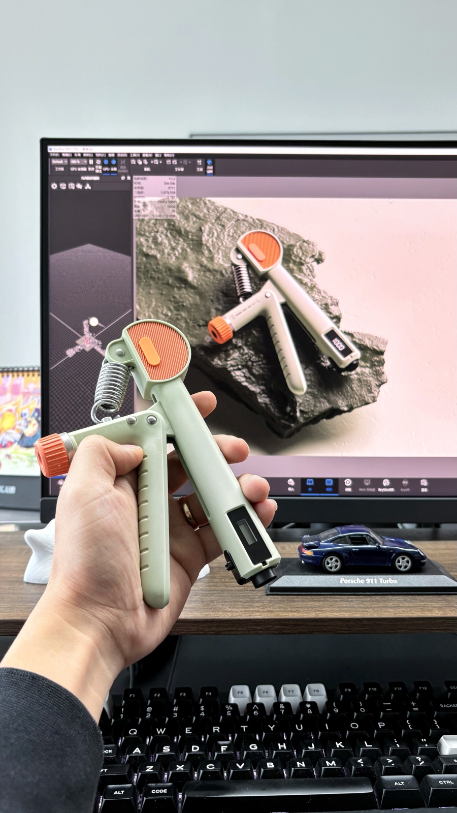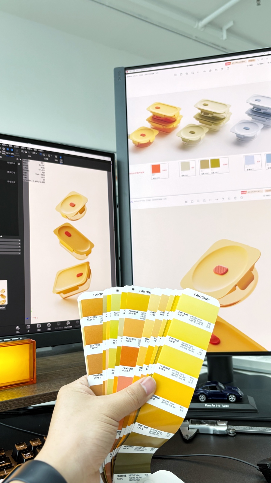 ⭕流程优化:设计师提升效率,优化设计流程。离不开好的工具//设备支持。①小沈在设计初期会用到AI来搜集设计,平时也会用到图片收集软件Eagle做素材分类。②然后用Procreate进行前期的产品方案草图探索,思考方案可行性。③从虚拟草图转移到Rhino//Keyshot,进行模型探索及配色渲染 ④借助3D打印进行手板验证。设计师时常需要“图纸”-“实物”转换,其中色彩这个环节贯穿始终,一个好的工具能够平衡好各个环节,提升设计开发过程中的效率。目前使用的明基SW272Q专业色准显示器很好的帮我做到了这一点,支持全链路色准,能够保证产品设计全链路的色彩沟通畅通无阻。像我们经常需要双屏协作渲染,或者与团队其他小伙伴沟通设计细节,这都需要不同显示器之间的色彩表现一致。这一台支持硬件校色,能从显示器硬件设置校准色彩。并且通过明基自研专业校色软件PMU搭配专业校色仪,即可实现多台显示器的色彩一致性调校,确保办公室小伙伴屏幕的色彩显示一致,让创意精准落地,工作效率直线提升!