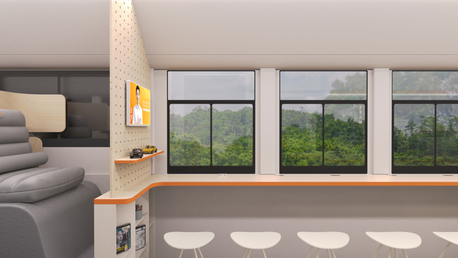区别于传统的新能源场站休息区,大巴车改造的休息空间,更像是旧与新的重叠,赋予这千辆新能源退役产品新的语言,从设计到功能,再到用户。