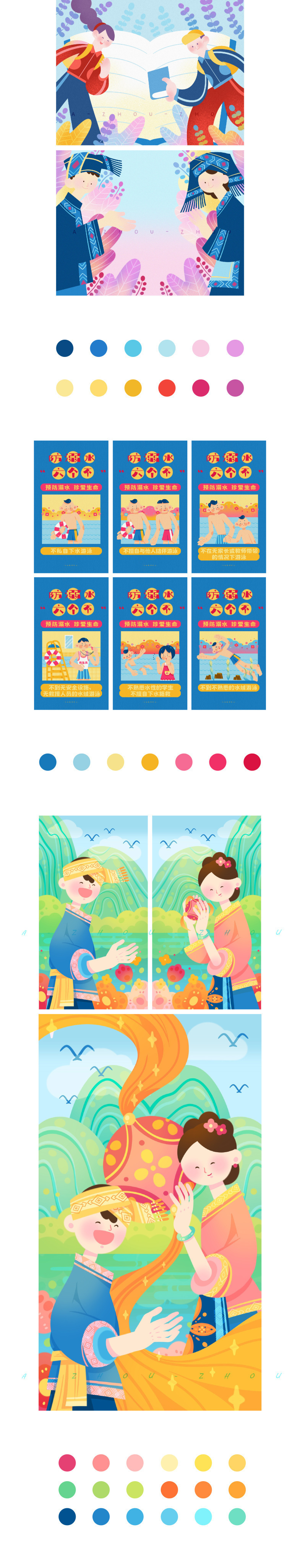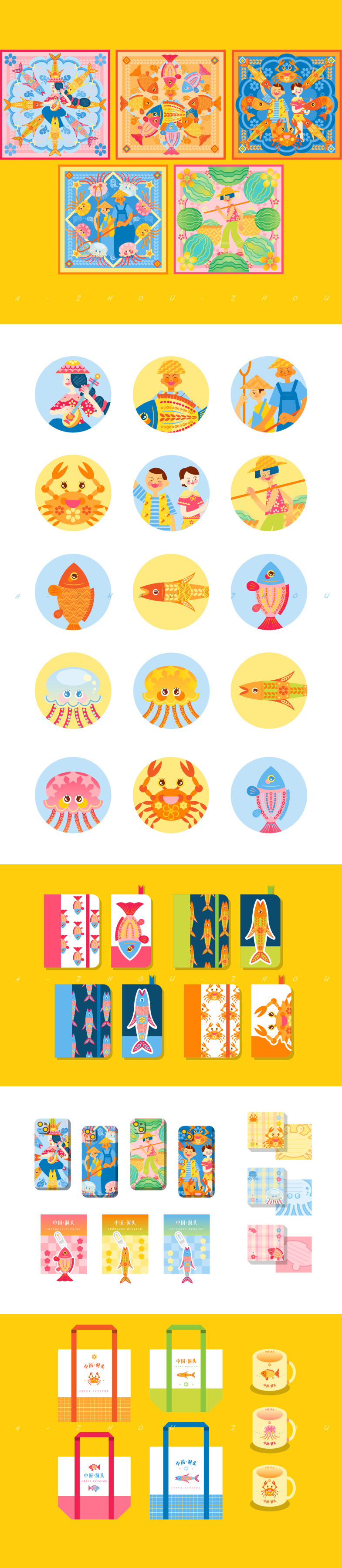 采用扁平化的手法,绚丽配色,取材自洞头渔民文化,创作了包括渔舟唱晚、乘风破浪、喜获丰收、瓜田劳作、趣赏花灯5个情景的一组插画。画面元素包括渔民、渔女、鱼、虾、蟹、水母、海浪、西瓜等。画面富有张力,色彩鲜艳,充分展现当地的民俗风情和新时代渔村的美好生活。并将插画应用在丝巾、笔记本、帆布包、茶杯等物品上,延伸出一系列文创产品,助力当地文化产业发展,为推动海岛共富增添活力。