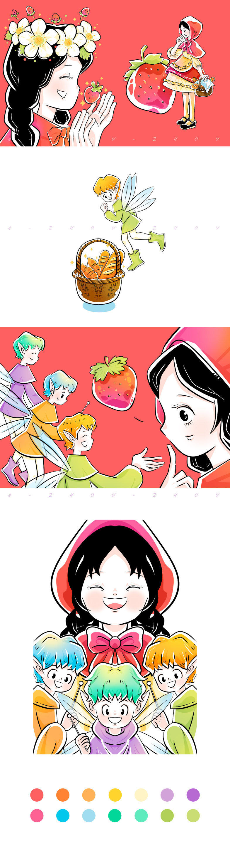 《森林中的三个小人》:源自《格林童话》,讲善恶有报的一个小故事,尝试给这个故事配插图。