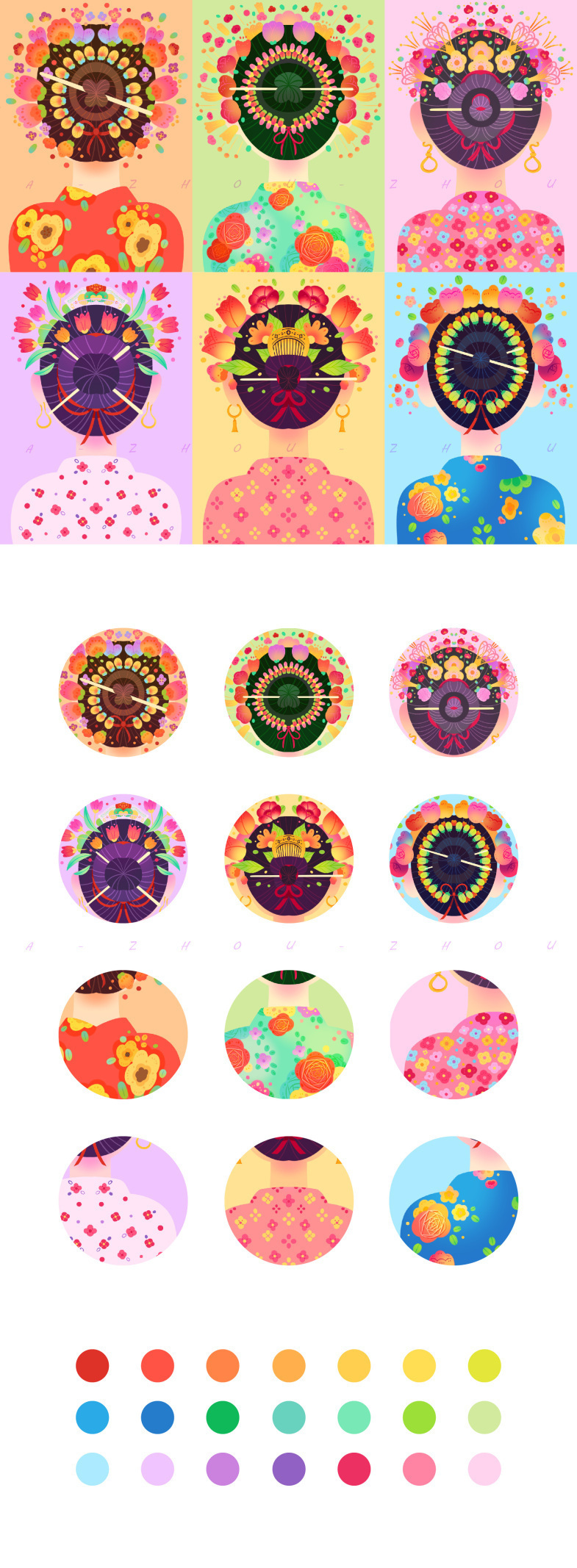运用扁平化风格,采取对称式构图,搭配绚丽和谐的颜色,绘制出各式各样的浔埔女。