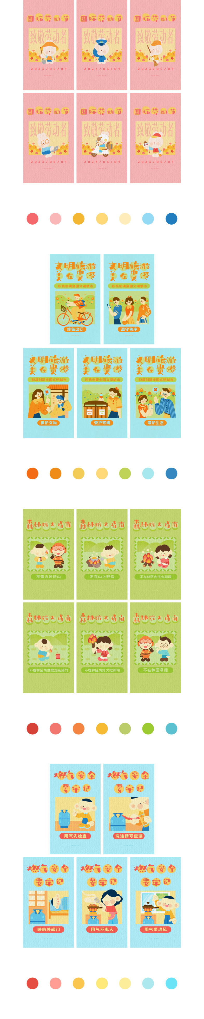 劳动节海报:选取农民、警察、清洁工、快递小哥、记者等作为劳动者代表,采用拟人手法,以生肖兔为原型,通过让小兔扮演不同的工作者角色,赞美劳动者坚守岗位、艰苦奋斗的劳动精神和爱岗敬业的品质。