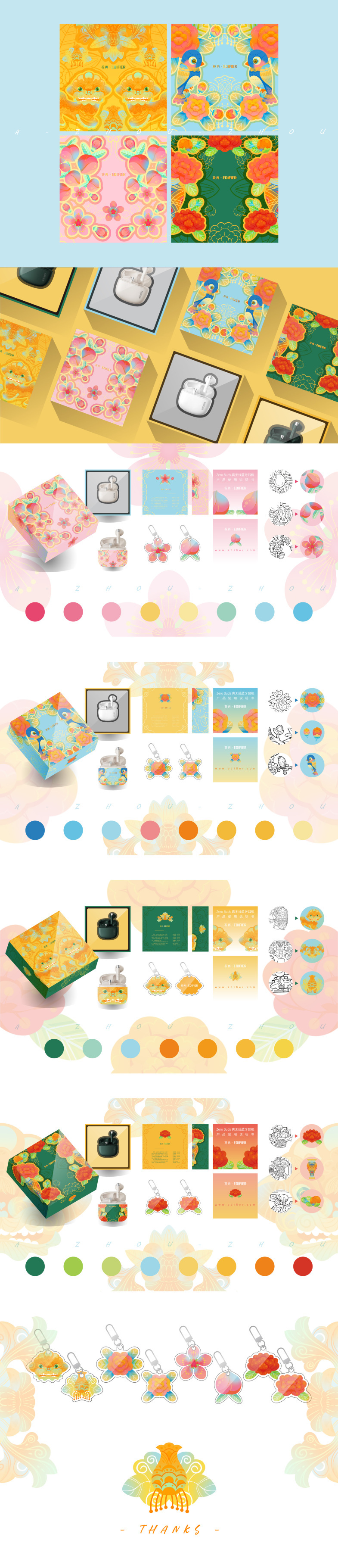 作品从宝安的绮云书室、曾氏大宗祠等广东省级文物古迹提取元素,对柁墩、雀替、灰塑看脊上的传统图案进行二次创作,设计了金狮献瑞、福寿延绵、鸟语花香、瓶生富贵四款国潮系列礼盒包装。