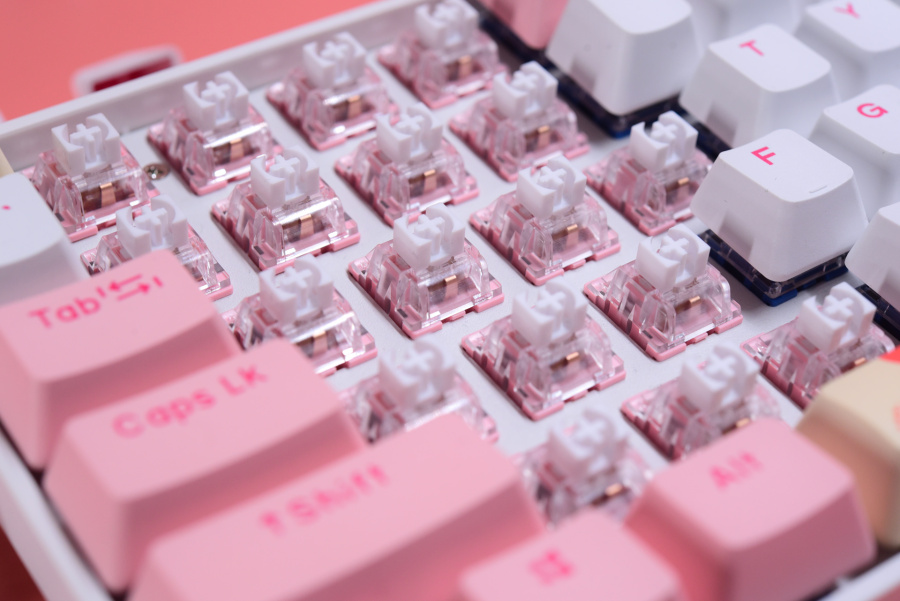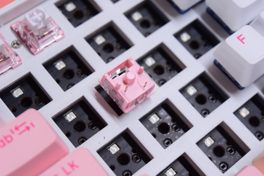 Q糖轴的除了颜色上选择了透明上盖以外,还采用了大卡扣设计,密闭性更强,拆的时候也更费劲了。从V1到Q糖,这次是改良了上盖,提升紧密性,降低轴盖晃动的杂音。